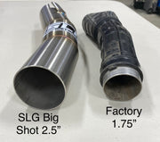 The SLG Big Shot intake is a must when it comes to a big horsepower build. In most cases with motor builds, they demand more air that the factory intake just can’t provide. This is an excellent solution to that problem. This has also been tested on factory machines and has proven to make horsepower in stock trim. The factory intake size is 1.75”, the SLG Big Shot is 2.5”. This also reduces the vacuum effect which will also keep a cleaner airbox. Keep in mind This is a DIY kit and does require someone with attention to detail for install. The kit comes with a template for where to cut your factory airbox. Once cut and fit up, drill a small hole through the airbox to screw in the provided fastener, this will hold the intake tube from sliding out. It is required by the end user to seal the gap between the air box and your new intake tube. I recommend U-418 urethane (not included, available on Amazon or your local windshield glass shop). You will also need to trim your hood to clear the stainless intake tube. We take no responsibility for any mistakes made during install as this is a cut to fit style install with many different ways of doing so. Be sure to plug or tape off your intake port after you remove your air filter until this install is complete. For any questions or tips give us a call.